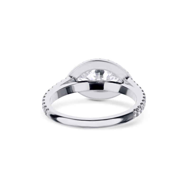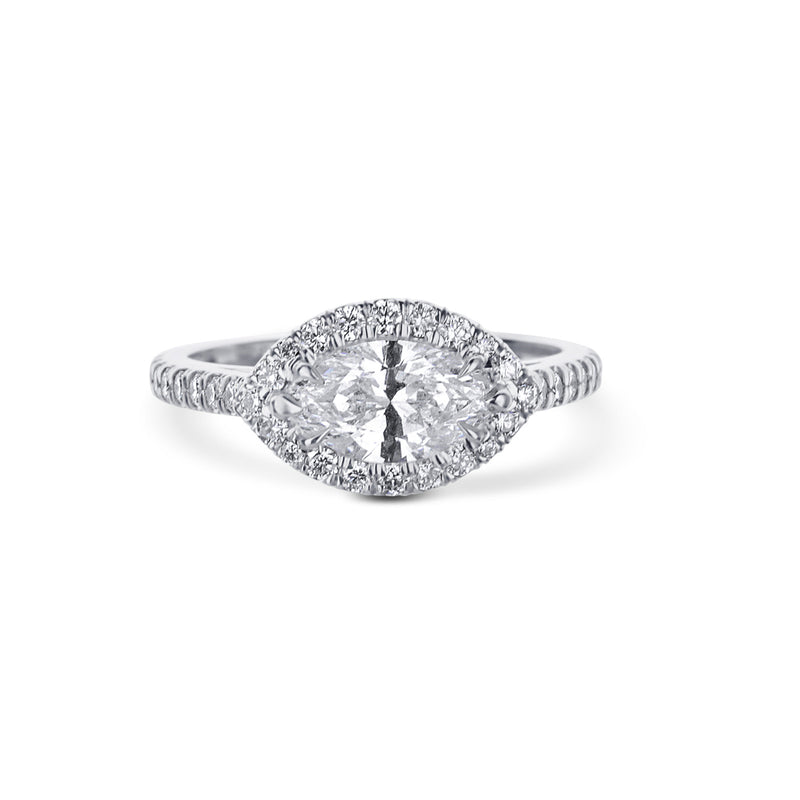 Take a twist on tradition with our magnificent marquise set east west in a halo setting. With a center stone displaying prominently at 1 carat, this ring set in 18K white gold with round diamonds down the shank is sure to inspire awe.