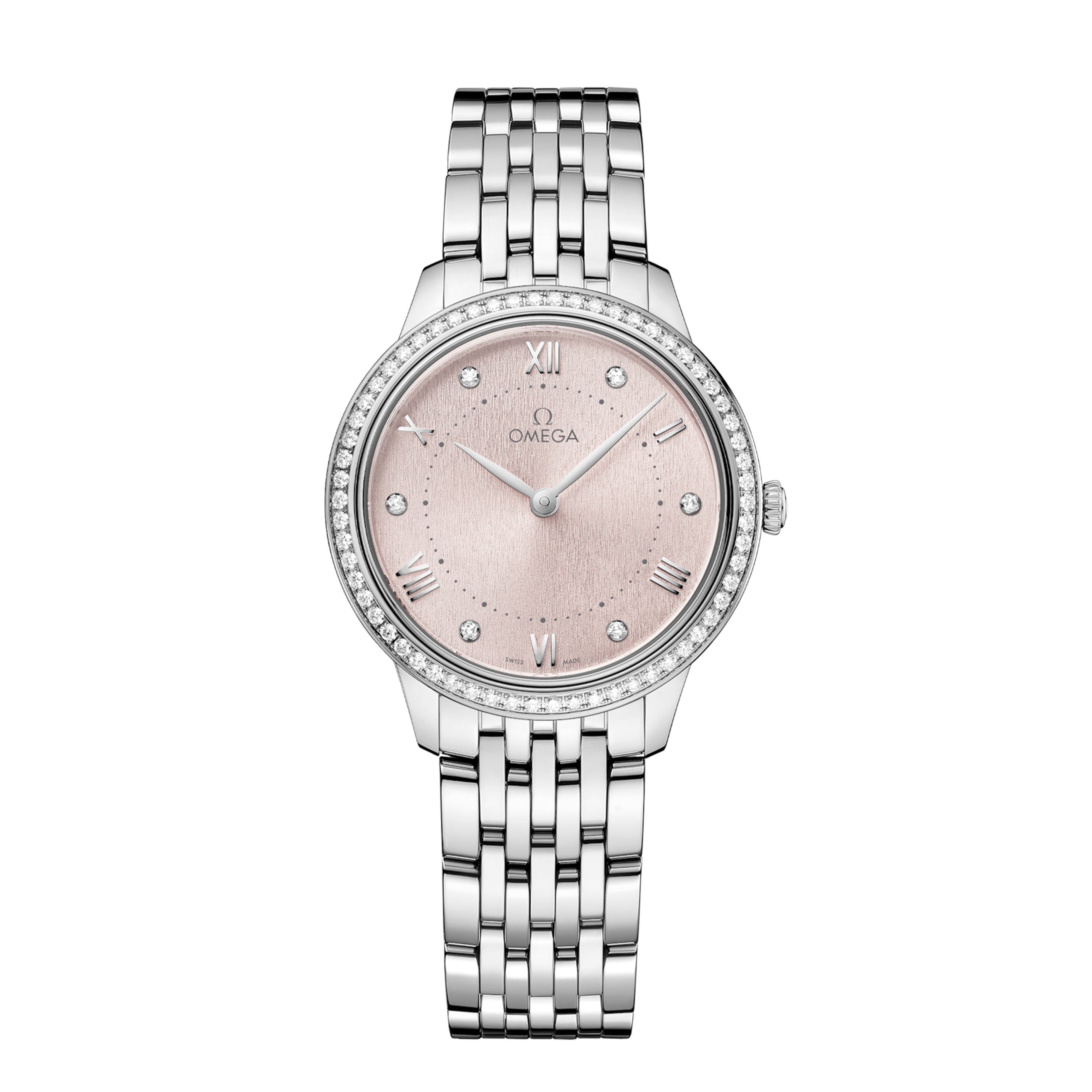 This 30 mm stainless steel model features a diamond-paved bezel and a PVD rose silvery dial with a stamped random vertical pattern in a sun-brushed finish. The display is distinguished by rhodium-plated hands, as well as alternating Roman numerals and diamond markers.