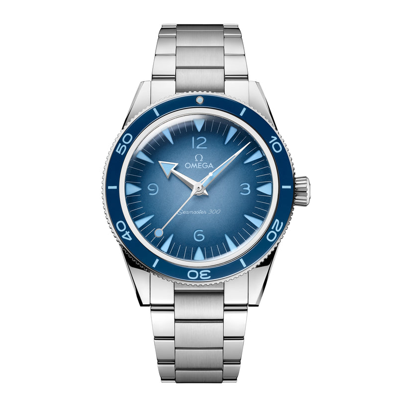 The varnished dial, in OMEGA’s own Summer Blue, has a gradient finish to reflect the watch’s level of water resistance. In keeping with the colour code, OMEGA has filled the rhodium-plated hands, recessed hour markers, and open numerals with a unique light blue Super-LumiNova.